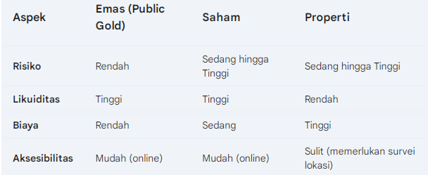 Dari tabel di atas, terlihat bahwa emas menawarkan kombinasi yang menarik antara risiko yang rendah, likuiditas yang tinggi, dan biaya yang terjangkau